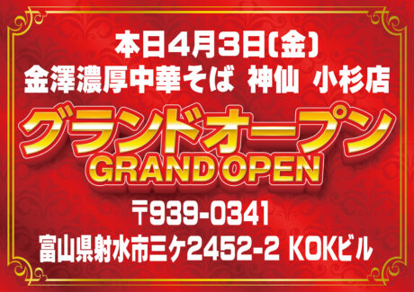 「金澤濃厚中華そば 神仙 小杉店」が新規オープンいたしました。